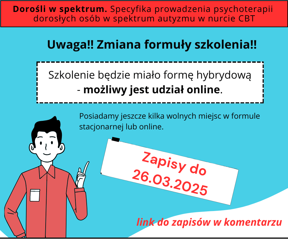 Serdecznie zapraszamy psychologów, psychoterapeutów i innych specjalistów pracujących z osobami dorosłymi w spektrum autyzmu na dwudniowe stacjonarne szkolenie specjalistyczne. Termin: 29-30 marca 2025 Limit 20 uczestników: ostatnie wolne miejsca w formule stacjonarnej i online. Plan…czytaj więcej: Szkolenie „Dorośli w spektrum” będzie w Bielsku-Białej: zmiana formuły i lokalizacji