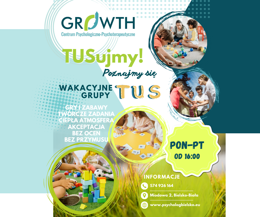Z przyjemnością informujemy, iż w naszym Centrum ruszył nabór na zajęcia Treningu Umiejętności Społecznych TUS dla dzieci w wieku 8-10 lat, 10-12 lat oraz dla nastolatków. PROGRAM stworzony we współpracy z psychologiem, pod…czytaj więcej: TUS dla dzieci i młodzieży! Nabór do grup TUS 2025/2026
