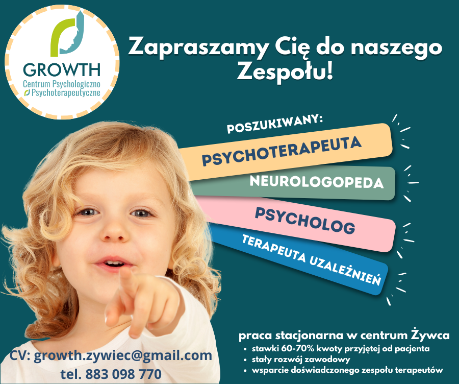 Centrum Psychologiczno-Psychoterapeutyczne GROWTH Sp. z o.o. w Żywcu, ul. 1 Maja 1/4 nawiąże współpracę ze specjalistami terapii dzieci i młodzieży. Oferujemy: POSZUKUJEMY OSÓB: SERDECZNIE ZAPRASZAMY! Osoby chętne prosimy o przesłanie dokumentów aplikacyjnych na adres:…czytaj więcej: Oferta współpracy